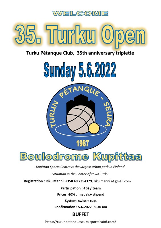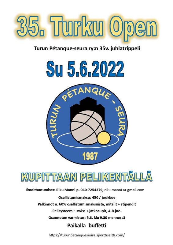 Turun Pétanque-seura järjestää Turku Open -trippelin jo 35. perättäisenä vuotena sunnuntaina 5.6.2022 klo 10.00 alkaen Kupittaan petankkikentillä Turussa. Kilpailu on Suomen vanhin joka vuosi järjestetty kilpailu. Kilpailu on myös seuran 35v. juhlakilpailu. Ilmoittautumiset: Riku Manni p. 040-7254379 joko soittamalla, tekstiviestillä, WhatsAppilla tai sähköpostitse: riku.manni at gmail.com. Osallistumismaksu 45€ / joukkue. Palkinnot noin 60% osallistumismaksuista, mitalit + stipendit. Pelisysteemi: swiss + jatkocupit, A, B jne. Osanoton varmistus 5.6. klo 9.30 mennessä. Paikalla myös buffetti, Tervetuloa. Liitteet