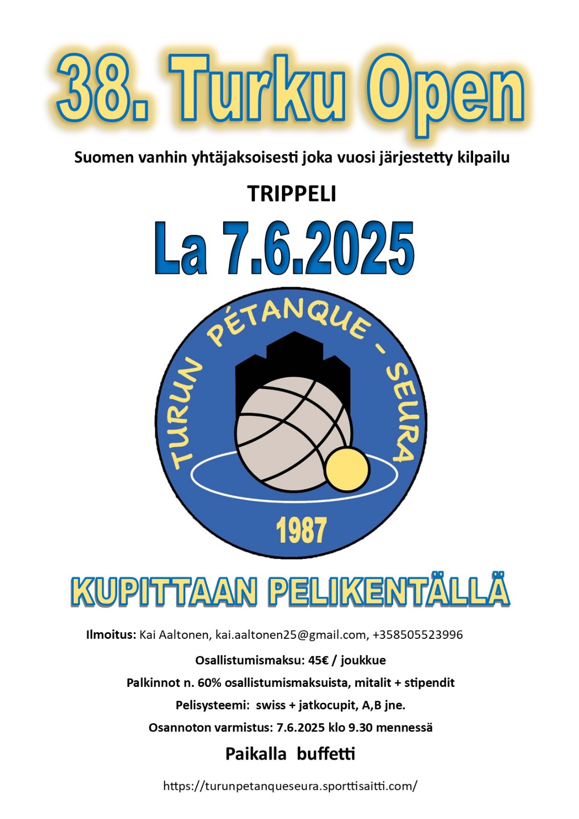 Turun Pétanque-seura ry järjestää perinteisen Turku Open -trippelin (YT) jo 38. perättäisenä vuonna lauantaina 7.6.2025 klo 10.00 Kupittaan petankkikentillä Turussa. Pelimuotona yleinen trippeli, swiss + A/B-cup. Osallistumismaksu 45€ / joukkue. Palkinnot noin 60% osallistumismaksuista, mitalit + stipendit. Ilmoittautumiset Kai Aaltoselle p. 0505523996 joko soittamalla, tekstiviestillä tai WhatsAppilla. Ilmoittautua voi myös pelipaikalla lauantaina 7.6. klo 9.30 mennessä. Osanoton varmistus myös viimeistään tällöin. Paikalla on myös monipuolinen buffetti. Tervetuloa Suomen vanhimpaan, yhtäjaksoisesti joka vuosi järjestettyyn kilpailuun. Liitteet